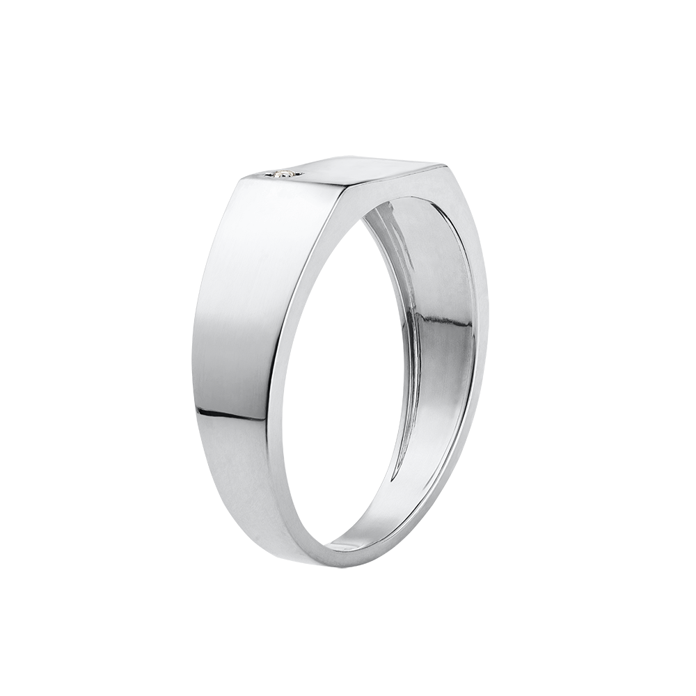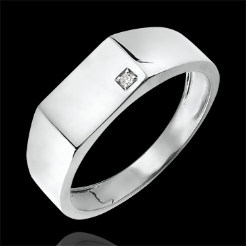 Une chevalière en or blanc, dont le plateau rectangulaire est serti d'un diamant étincelant. Un bijou résolument moderne. 1 diamant : 0.01 carat - Or blanc (9 carats = 375/1000): 3.3 g. Plus dimensions
