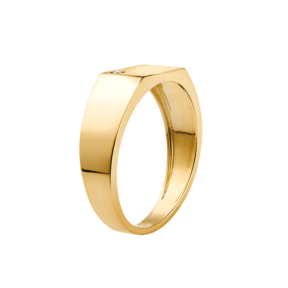 Une chevalière en or jaune, dont le plateau rectangulaire est serti d'un diamant étincelant. Un bijou résolument moderne.