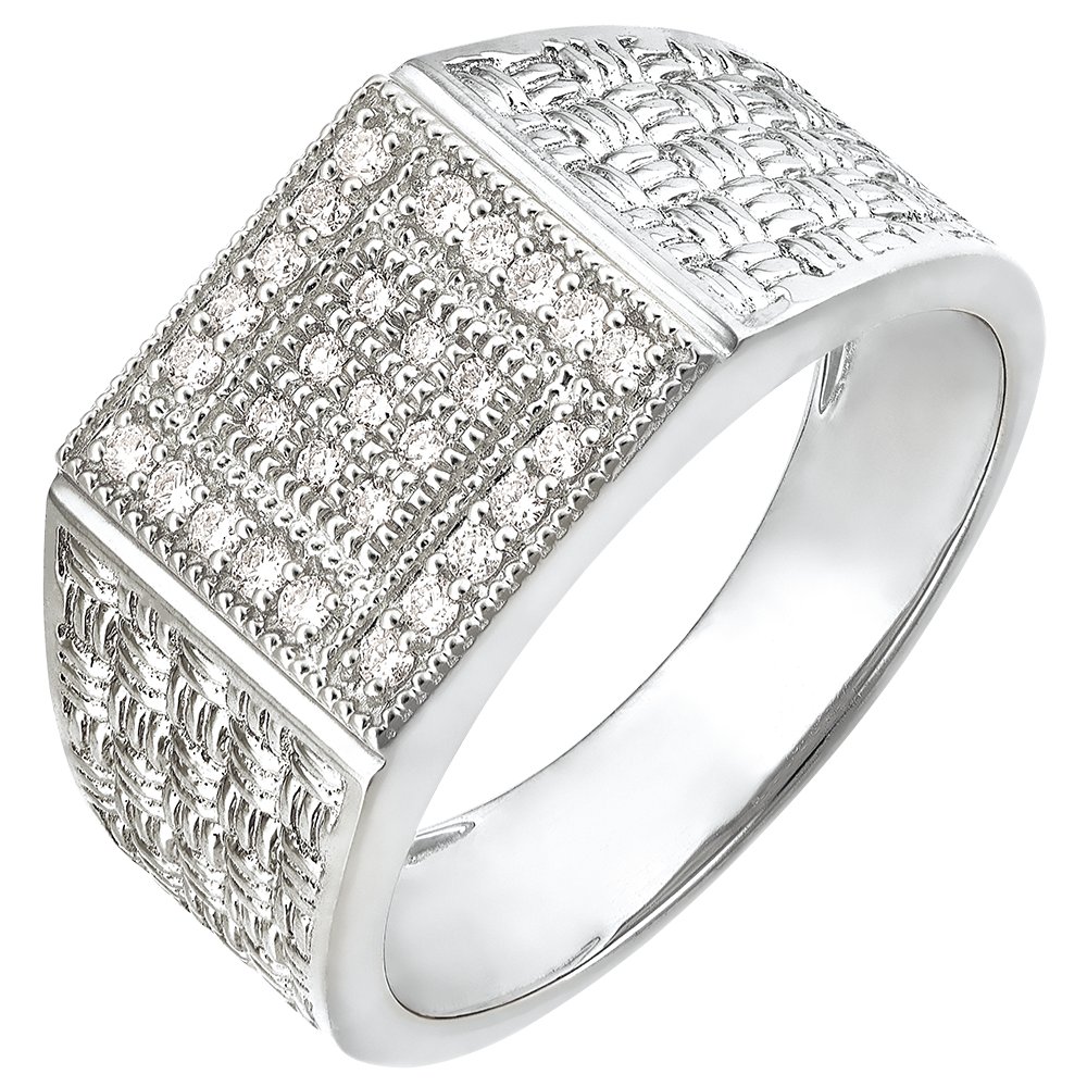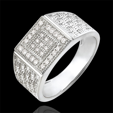 Une chevalière tissée d'or blanc et dont le centre à base carrée est généreusement pavé de 29 diamants. Un bijou délicat et imposant à la fois. 29 diamants : 0.26 carat - Or blanc (18 carats = 750/-): 7.5 g. Plus dimensions