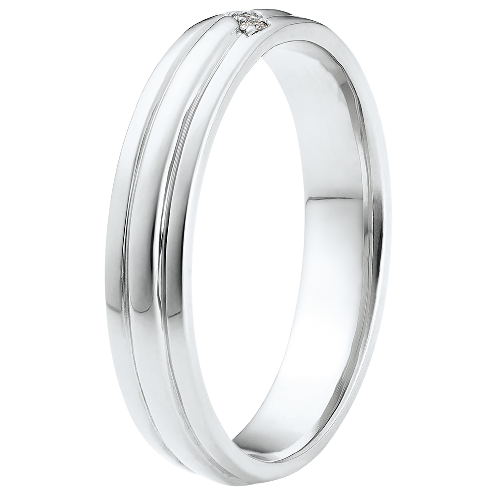 Cette bague offre un design résolument moderne : deux lignes droites horizontales surmontées d'une griffe sertie de 3 diamants. 3 diamants : 0.03 carat - Or blanc (9 carats = 375/1000): 4 g. Plus dimensions