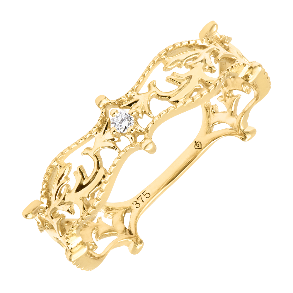 Une dentelle de feuilles délicatement ciselées s’enroule autour du doigt, comme une couronne végétale en or. En son cœur, un diamant solitaire capte la lumière. Une bague poétique, à la fois organique et précieuse, inspirée de la beauté de la nature.