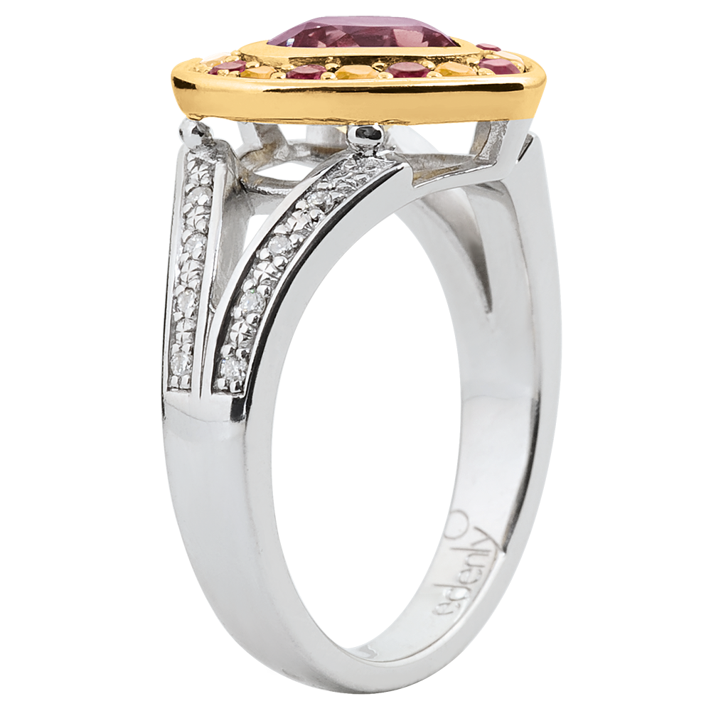 Rhodolite : 1 - Citrine jaune : 9 - Grenat : 9 - Diamant : 16 - Total: 1.8 caratVoir plus