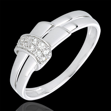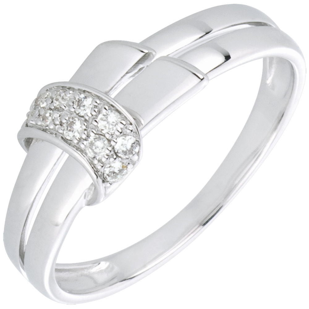 Cette bague large en or blanc 18 carats présente un design élégant avec un double ruban enlacé par un anneau pavé de dix diamants blancs.