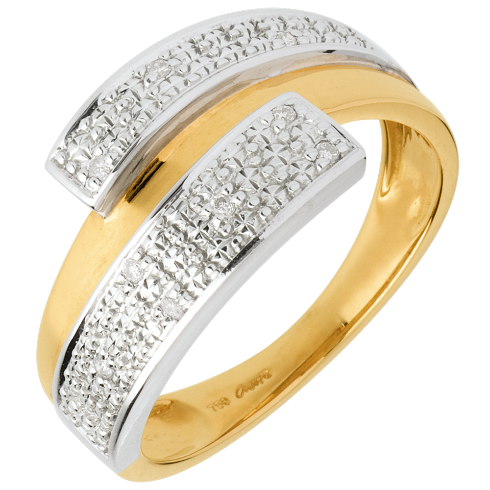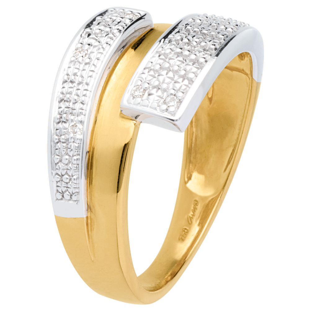 Un anneau or jaune avec retour deux hémisphères or blanc pavées diamants, pour une bague chevauchée d'éclat.
