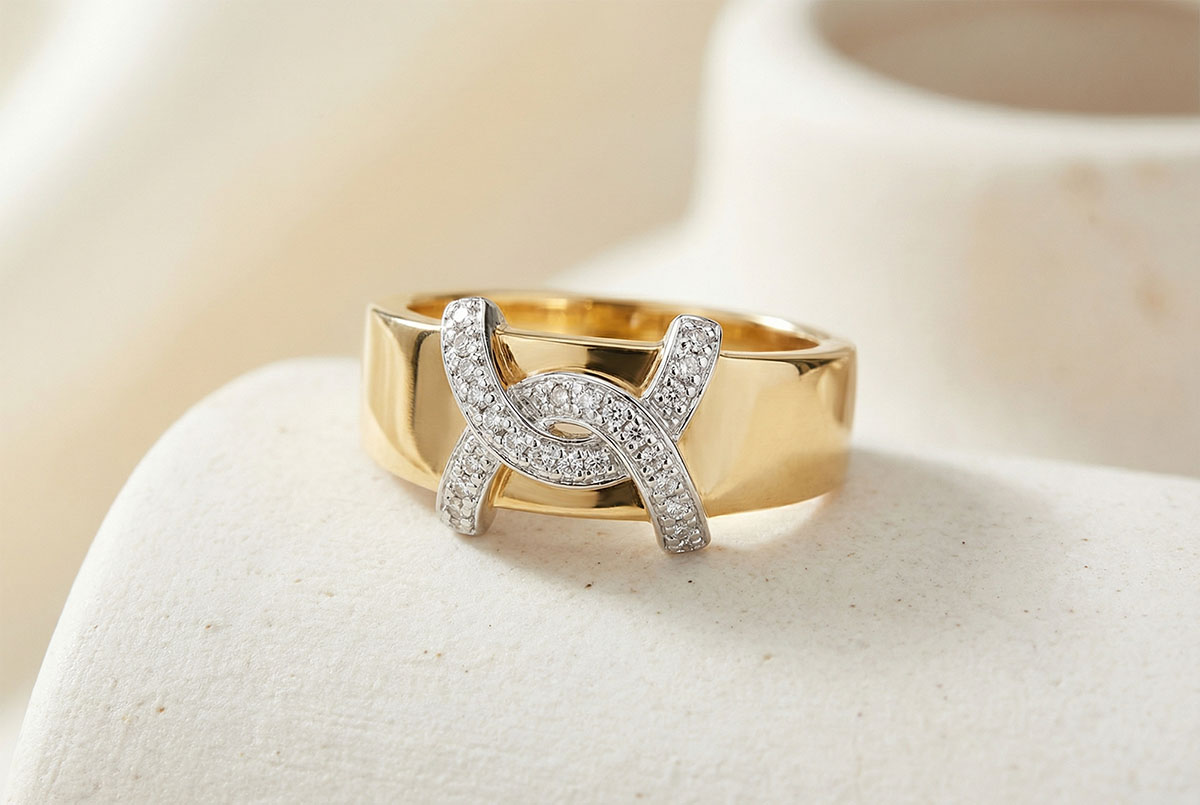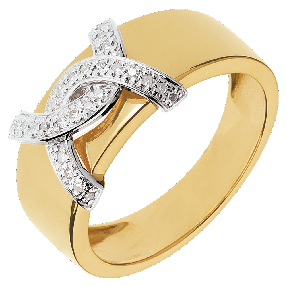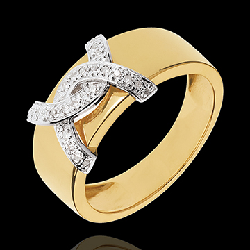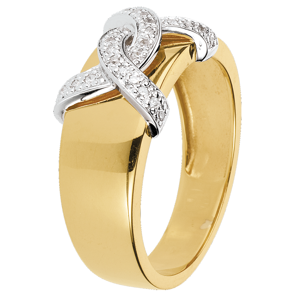 tels deux êtres enlacés, deux boucles or blanc et diamants s'unissent autour d'un anneau en or jaune
