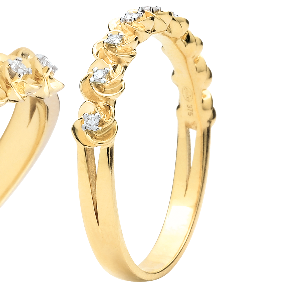 En une couronne de fleurs étincelantes, les pétales s'ouvrent pour découvrir un coeur de diamant éternel. Elle est divine en alliance ou en anneau romantique. 9 diamants : 0.05 carat - Or jaune (18 carats = 750/-): 1.8 g. Plus dimensions