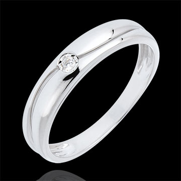 Un anneau d'or blanc est sillonnée par une courbe harmonieuse sur laquelle trône un diamant solitaire. Une alliance unisexe pour homme et pour femme.