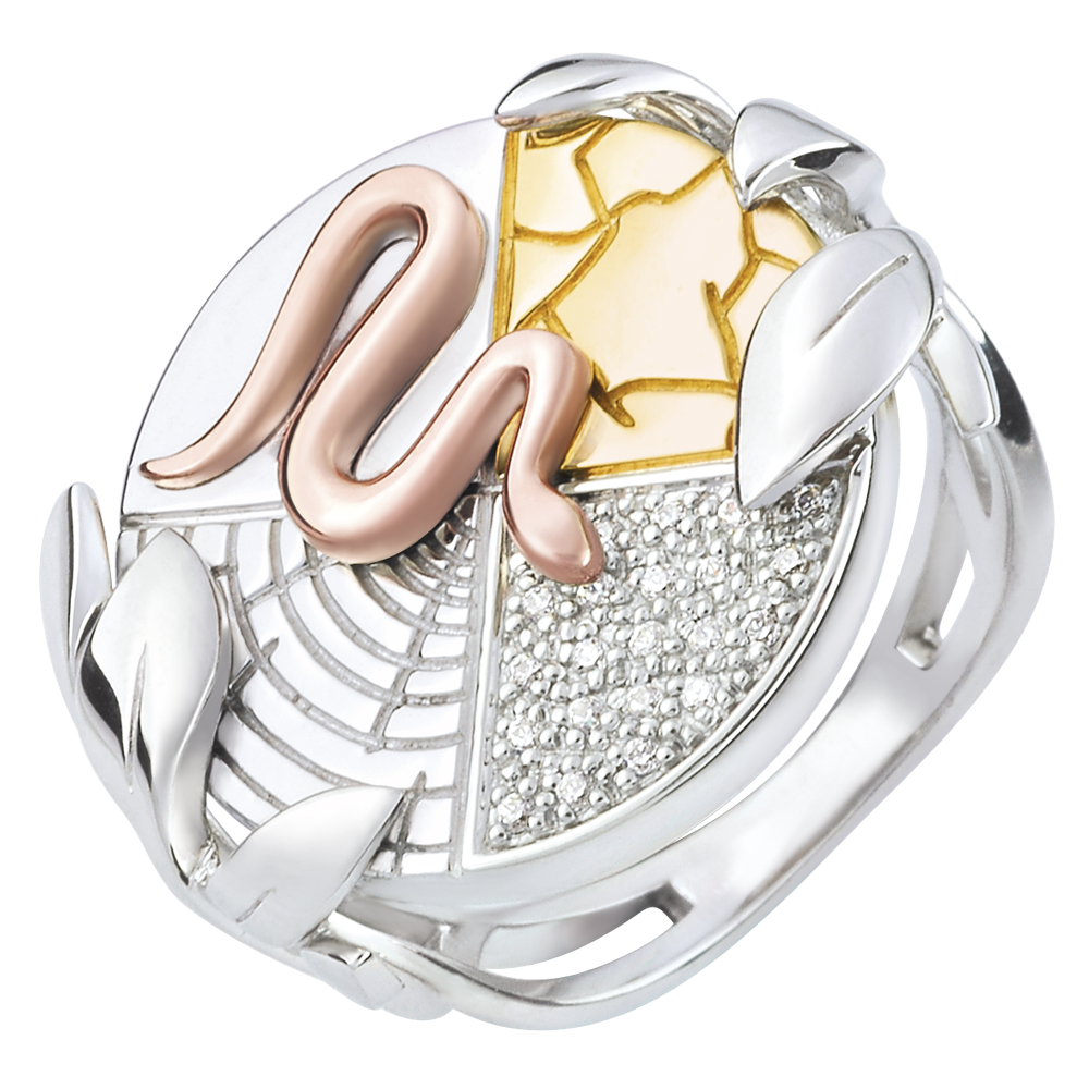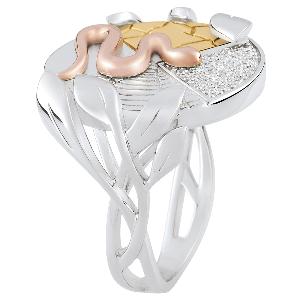 Une bague en or et diamants qui symbolise l'esprit de la Terre. Comme une tranche de vie, la base de la bague enserrée par un feuillage reprend des motifs de la nature: les veines du bois, les cristaux de la glace, la placidité de l'eau et les craquelures du désert. Le serpent amène la vie, posé sur l'incarnation de la nature et de la Terre. 21 diamants : 0.08 carat - Trois ors (18 carats = 750/-): 8.3 g. Plus dimensions