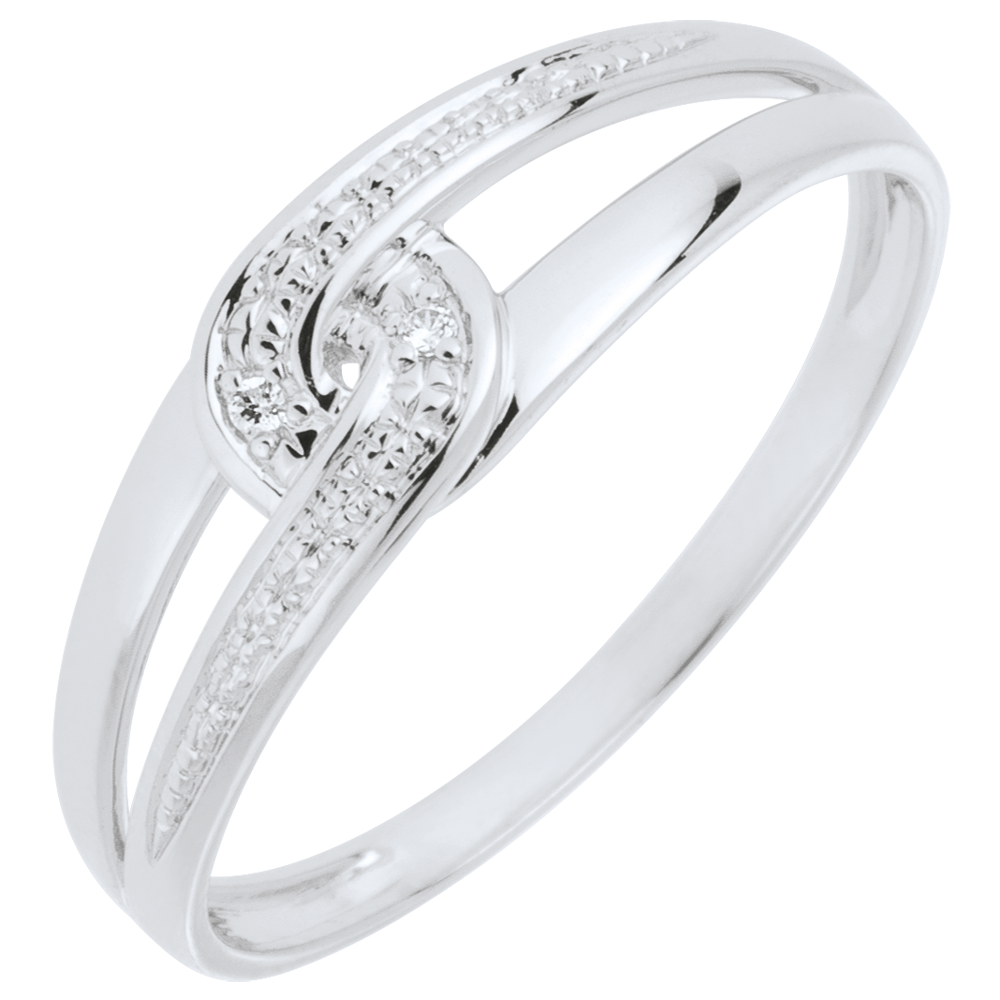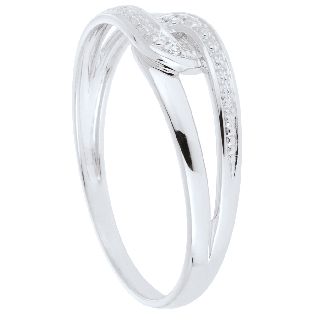 Deux boucles d'or blanc s'entremêlent et s'unissent autour des diamants.