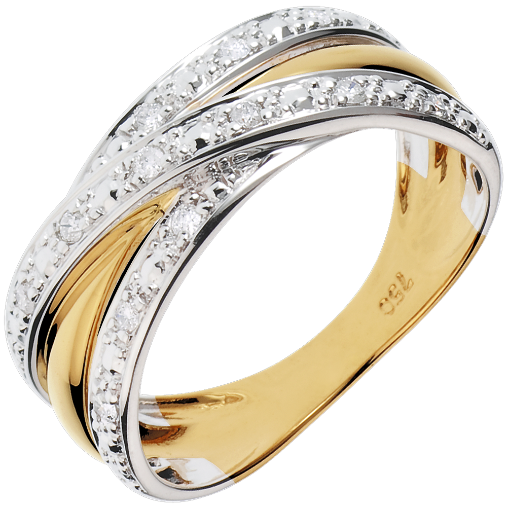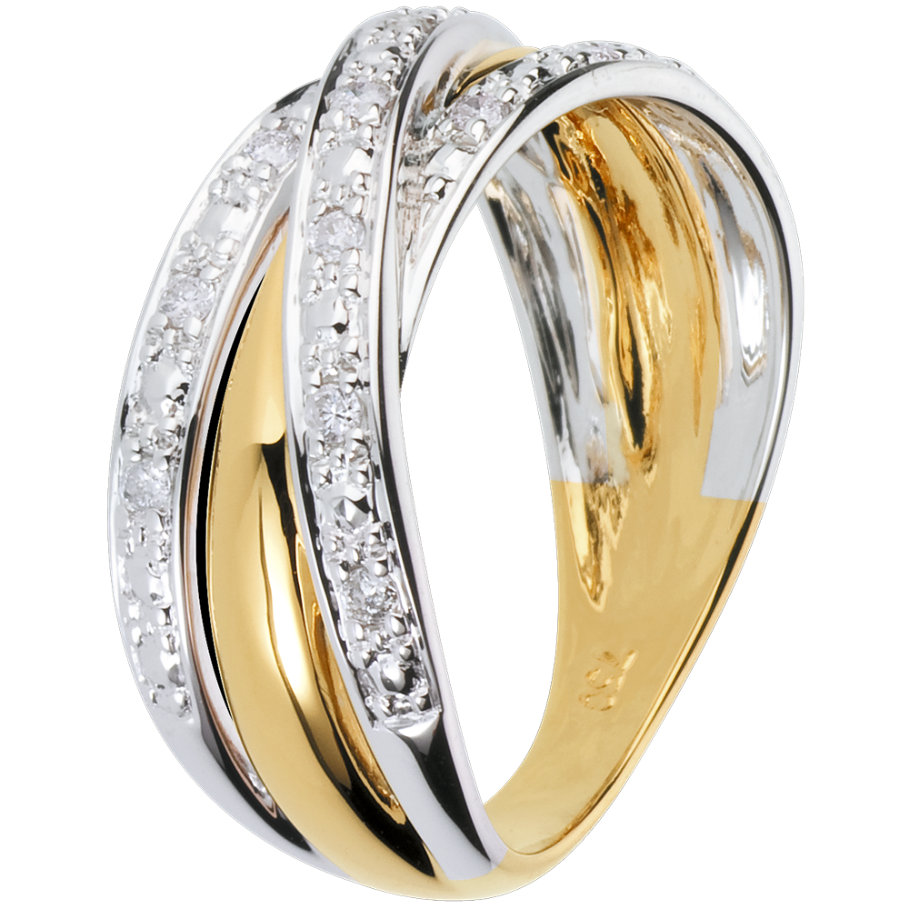 Une monture aux arceaux entrelacées mêlant l'or jaune au pavage blanc des diamants.