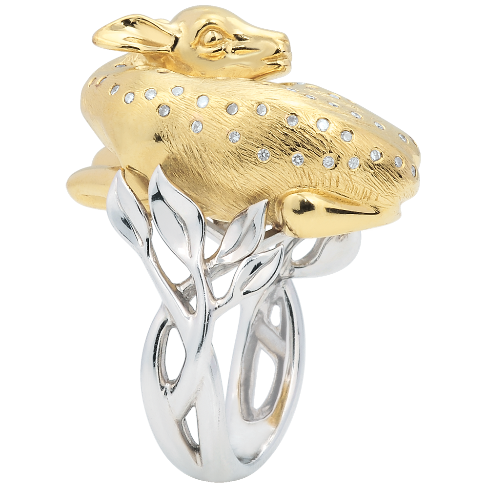 Une biche délicate mouchetée de diamants est endormie sur son lit de feuillages. Le corps de la biche est en argent recouvert d'or jaune. Le détail du pelage est travaillé à la main. Dimensions du faon: 2.5 cm de longueur, 1.3 cm de largeur et 1.5 cm de hauteur. 60 diamants : 0.26 carat - Argent massif 925/-: 11.8 g. Plus dimensions