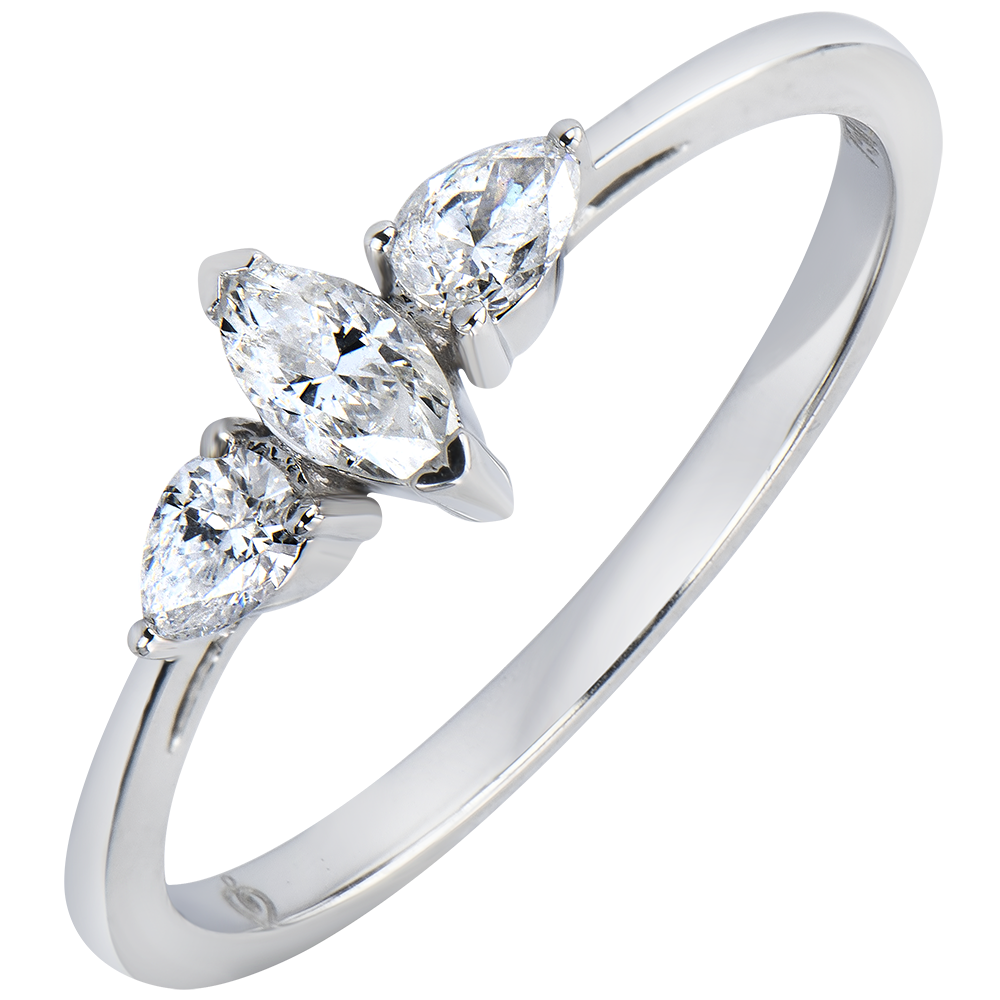 La délicatesse d'une triologie diamants, qui marie avec élégance un diamant marquise à deux diamants poire.