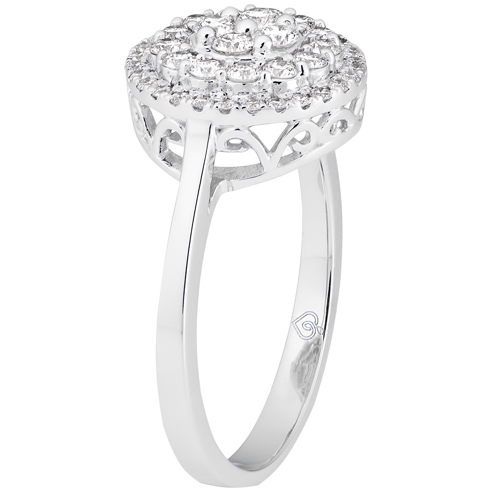Une monture travaillée qui surélève un pavage diamant concentrique, et qui reprend les formes d'une joaillerie romantique. Un halo scintillant pour une bague noble et élégante.