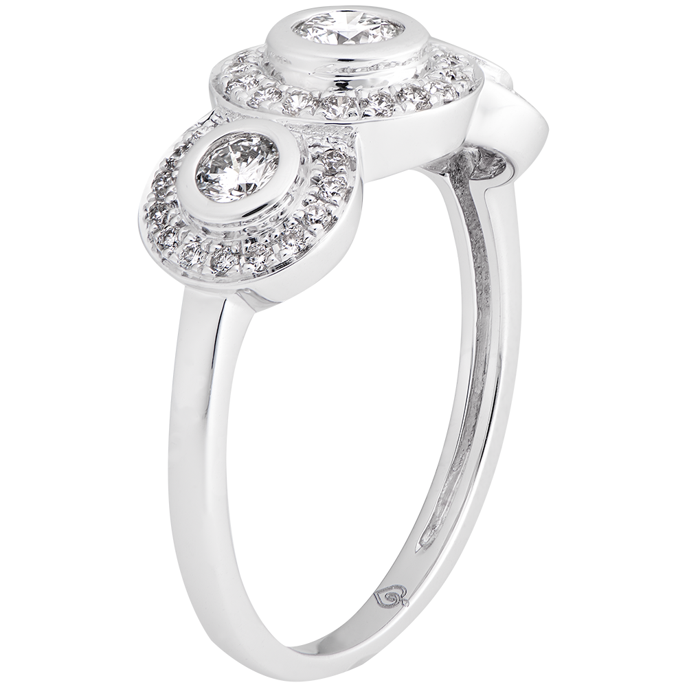 Une trilogie de halos diamants pour une bague qui revisite les codes du barroque avec élégance.