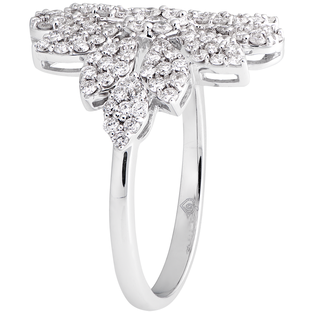 Un motif floral revisité dans un style impérial et précieux, pour cette bague graphique aux pétales pavés. Un modèle statutaire et majestueux pour un bijou quasi enchanté. 111 diamants : 0.75 carat - Or blanc (9 carats = 375/1000): 2.9 g. Plus dimensions