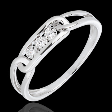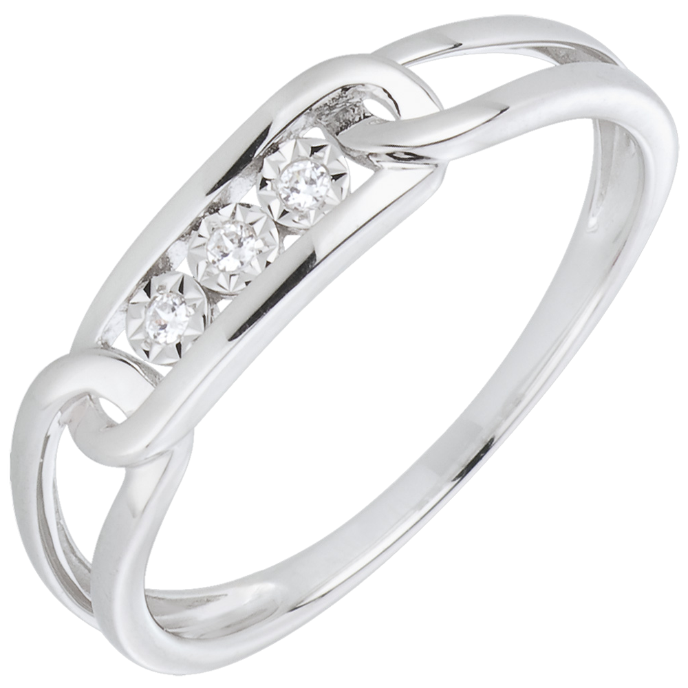 Trois diamants sont pris dans un des maillons de cette bague en or blanc