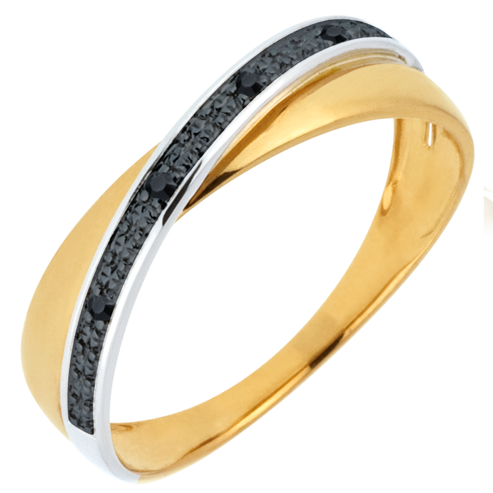 Un anneau d'or jaune est traversé d'un anneau d'or blanc parsemé de diamants noirs.