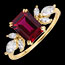 Un rubis synthétique taille émeraude de 2 carats, entouré de six diamants synthétiques taille marquise, compose cette bague raffinée en or jaune 9 carats.