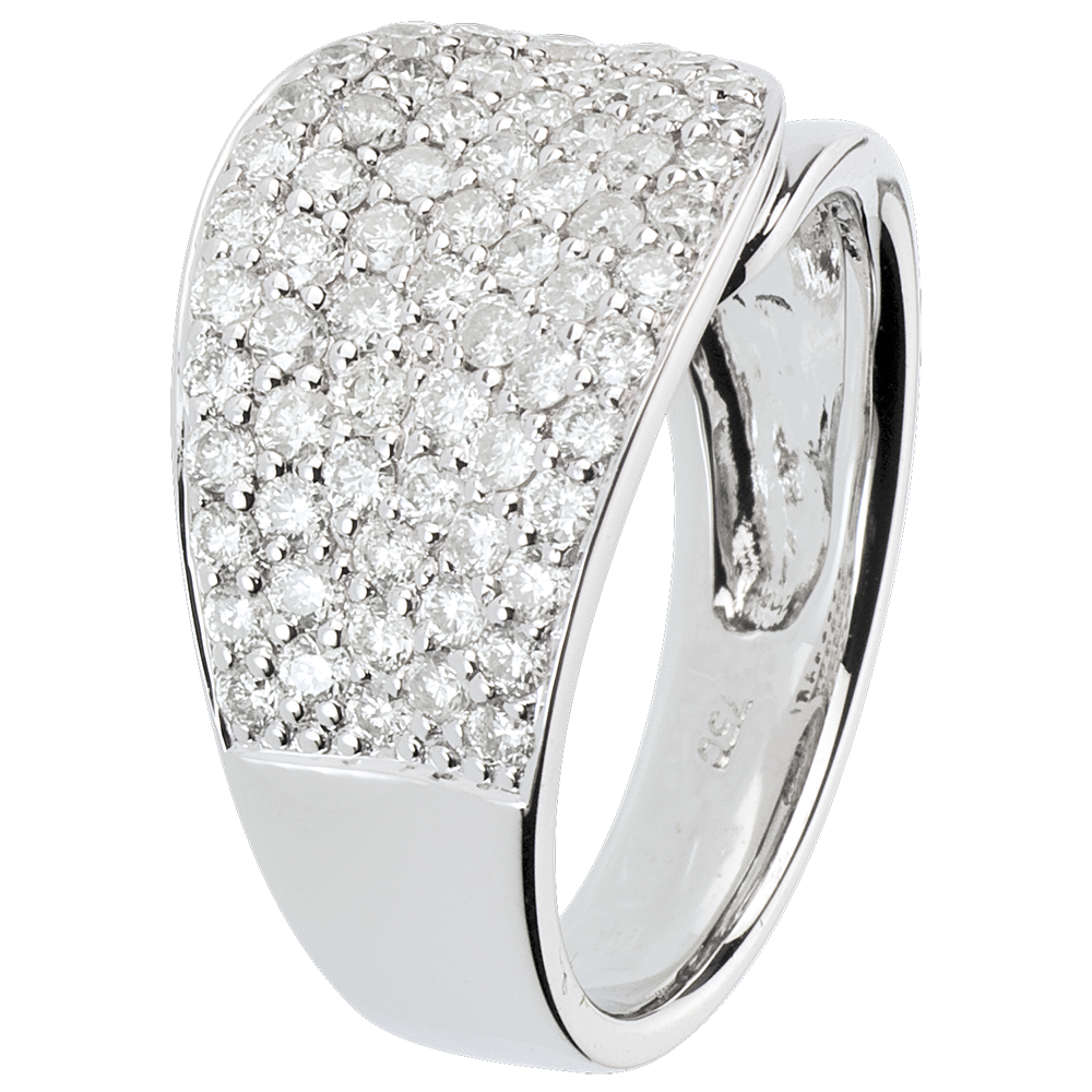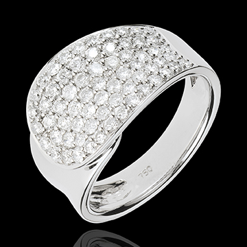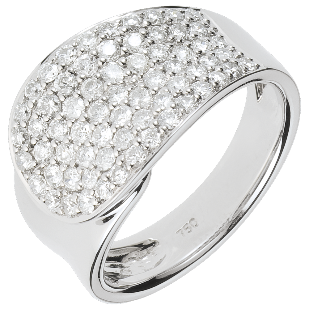 une langue de diamants en pavage est déliactement posée sur son anneau d'or blanc