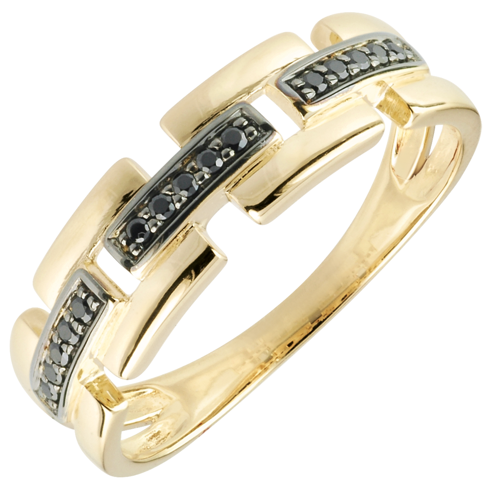 Deux lignes d'or en pointillés sont séparées par des pointillés de diamants noirs. Une Bague Clair Obscur moderne et féminine.