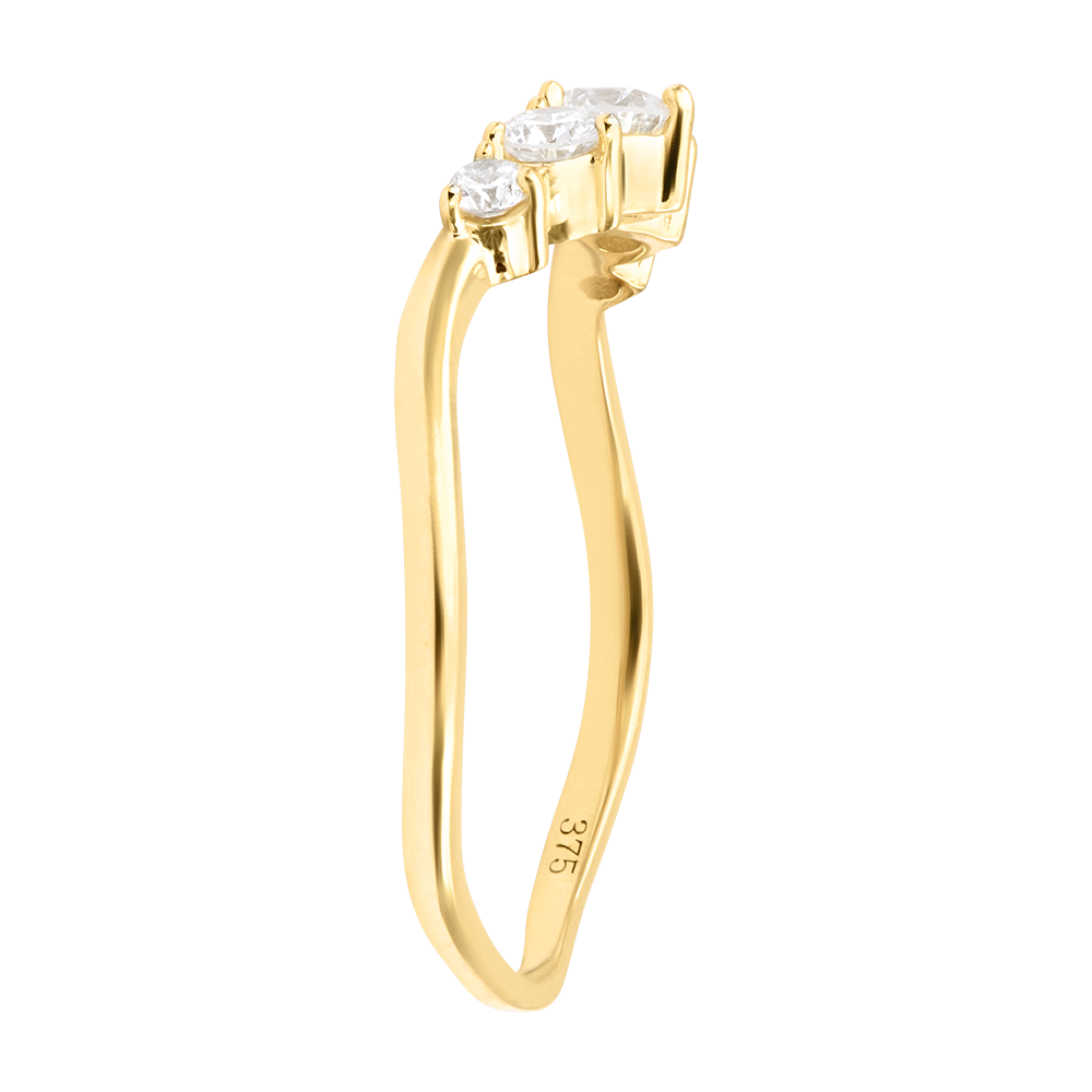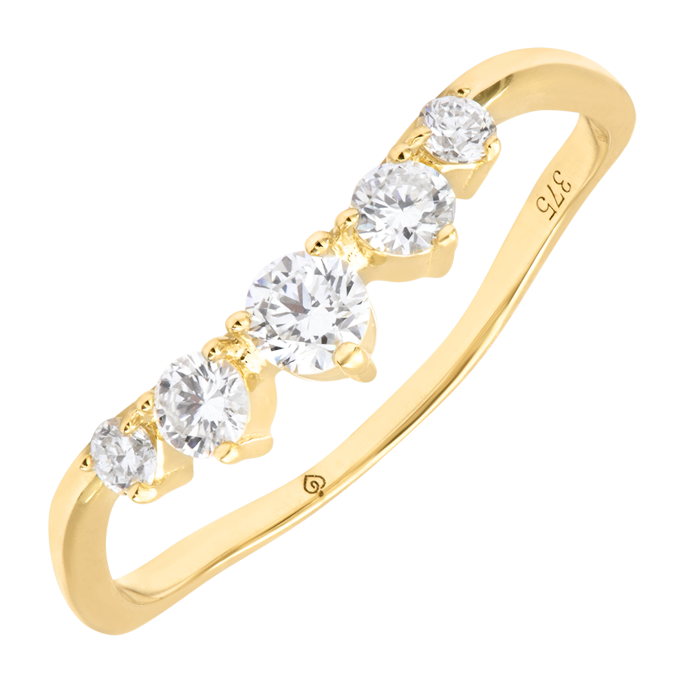 Cinq diamants synthétiques étincelants dessinent une douce courbe lumineuse au sommet de cette bague en or jaune 9 carats. Cette création délicate évoque une couronne de lumière, apportant une touche subtile et raffinée à votre main. Son design créatif s'inspire de la beauté naturelle, offrant une élégance légère et accessible.… Voir plus Infos techniques