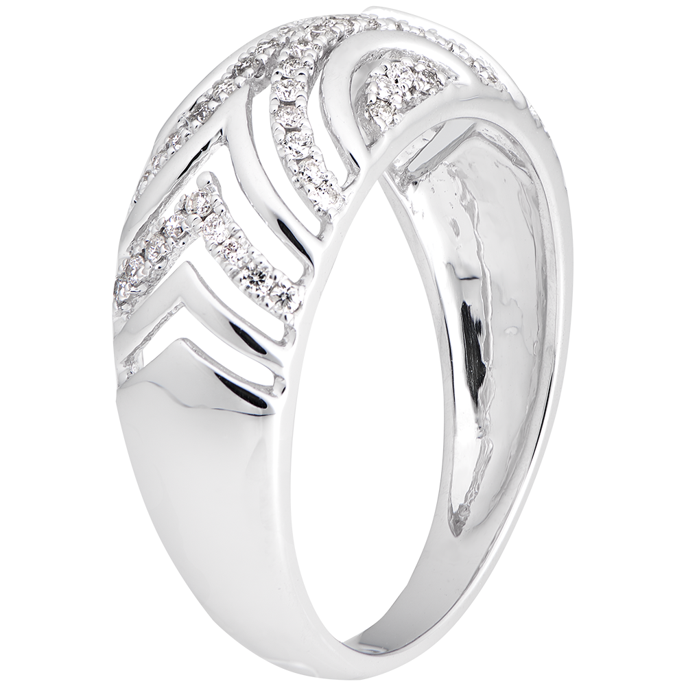 Une bague bombée et ajourée, aux motifs art deco pavés diamants, qui revisite avec équilibre les codes du style retro. Une grâce intemporelle.