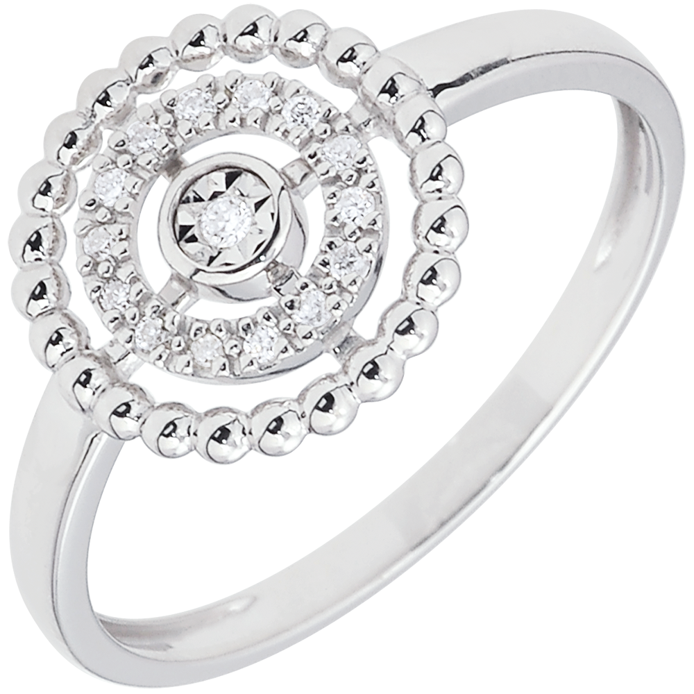 Un cercle de perles d'or entoure un cercle de diamants et un solitaire en son centre. 15 diamants : 0.05 carat - Or blanc (18 carats = 750/-): 2 g. Plus dimensions