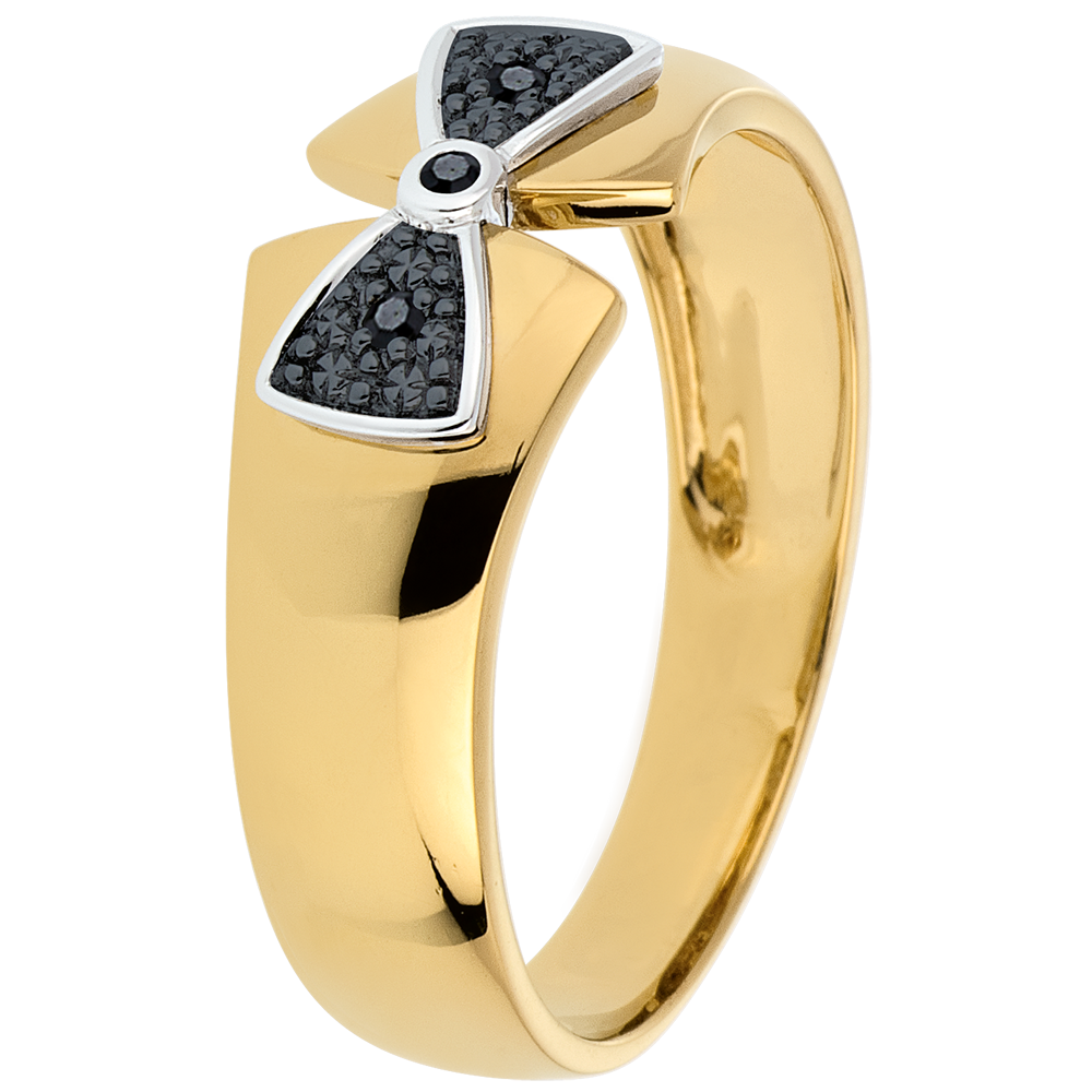 Un ruban d'or jaune est refermé par un noeud d'or blanc, rhodium noir et diamants noirs pour ceinturer votre doigt. Diamant : 0.02 carat - Or jaune (9 carats = 375/1000): 2.3 g. Diamant noir : 3 - Total: 0.017 carat Plus dimensions