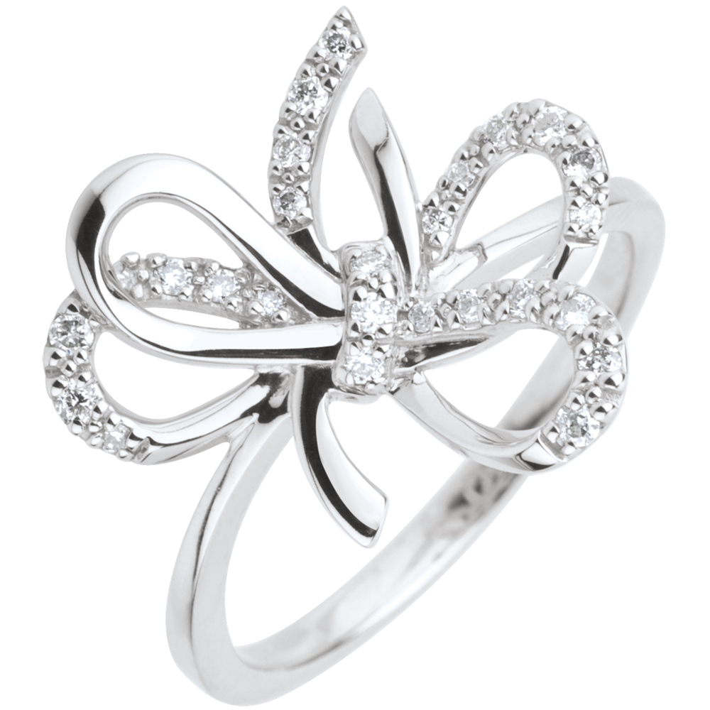 Un noeud fantasque et aérien se pose en suspension sur votre main, illuminé par l’éclat délicat de l’argent et de 25 diamants scintillants.