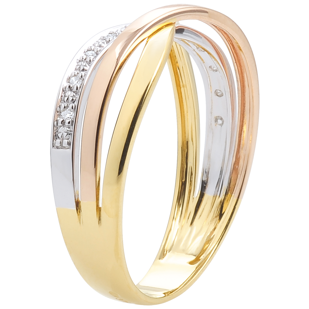 Un anneau or blanc pavé de diamants épousé par deux anneaux d'or jaune et rose pour un luxueux voyage sur Saturne. Une bague trois ors intemporelle et féminine.