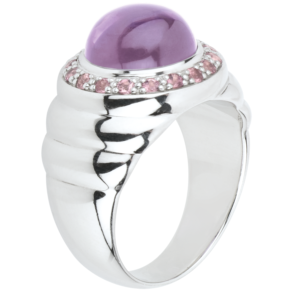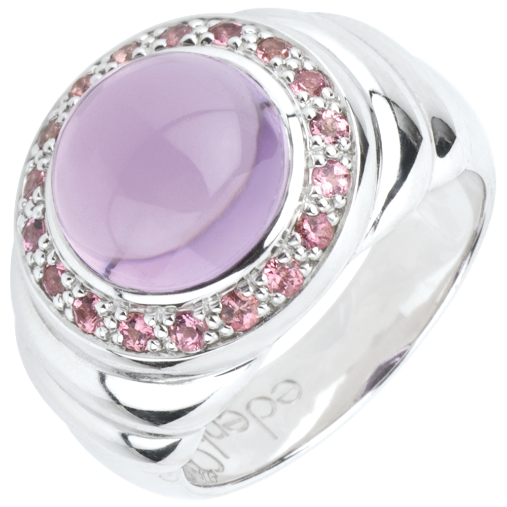 La bague Orthense est sertie d’une améthyste cabochon et de tourmalines roses, toutes deux de qualité minimum Very Good, assurant un éclat et une beauté durables.