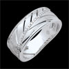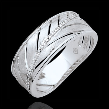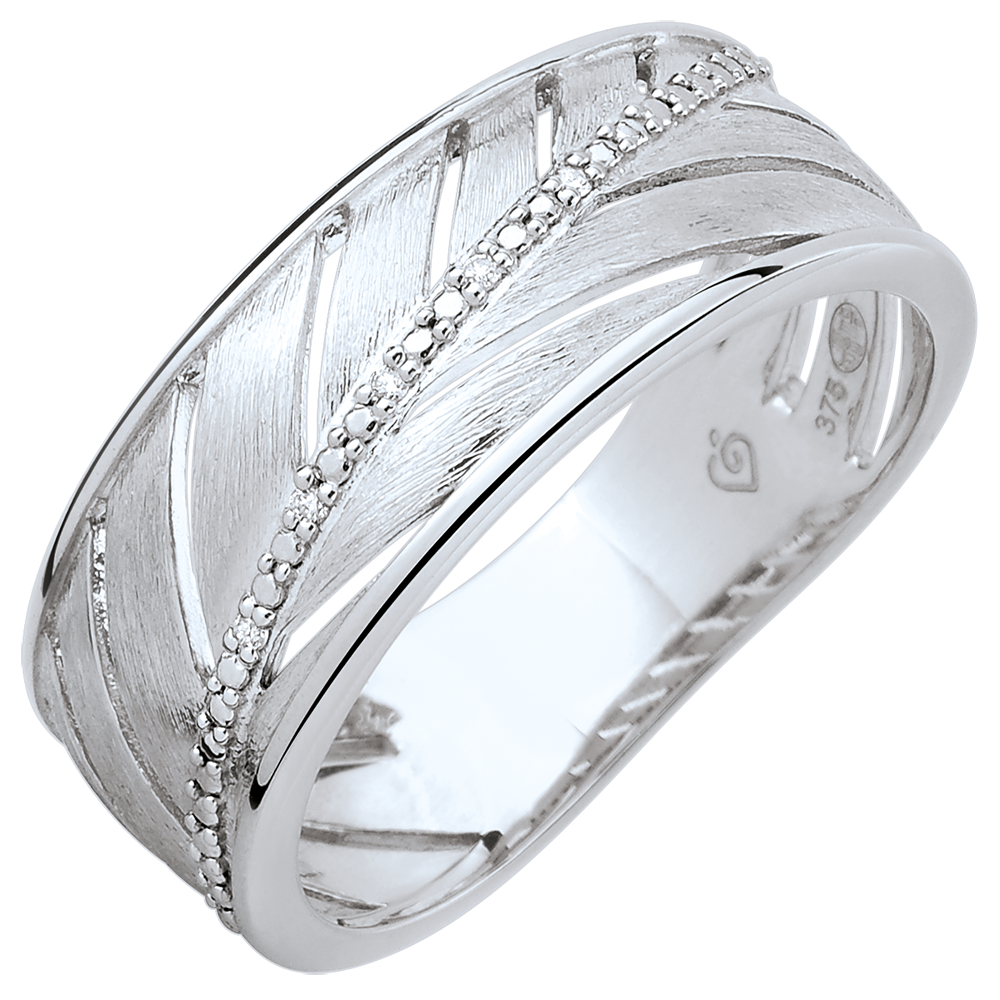 Une bague large en or blanc brossé toute en légèreté inspirée de la feuille de palme. Sa tige principale est ornée d'une rivière de diamants. Une bague à porter tous les jours ou pour les grandes occasions. 5 diamants : 0.02 carat - Or blanc (18 carats = 750/-): 4.1 g.Plus dimensions