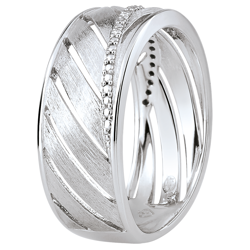 Une bague large en or blanc brossé toute en légèreté inspirée de la feuille de palme. Sa tige principale est ornée d'une rivière de diamants. Une bague à porter tous les jours ou pour les grandes occasions. 5 diamants : 0.02 carat - Or blanc (9 carats = 375/1000): 3.4 g.Plus dimensions