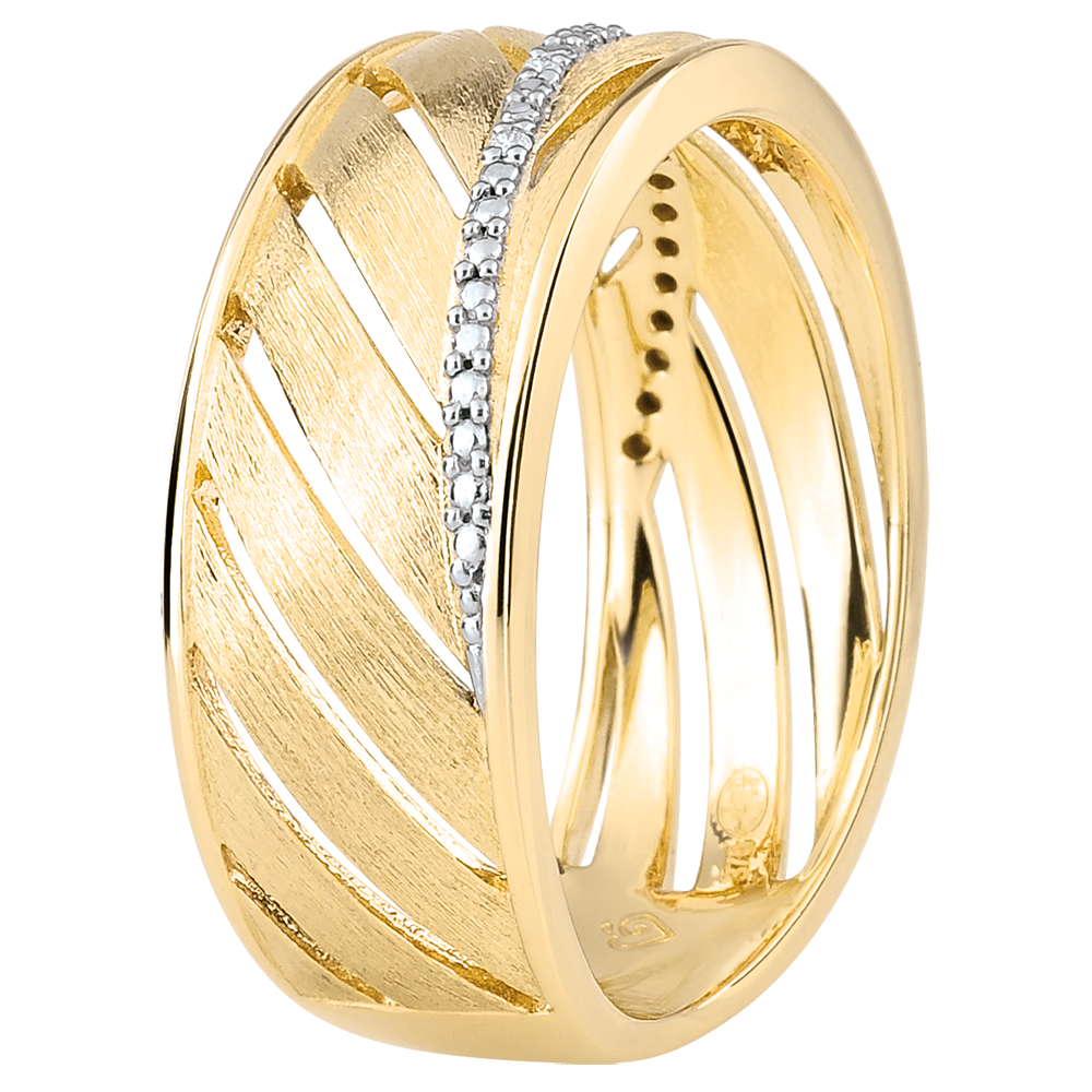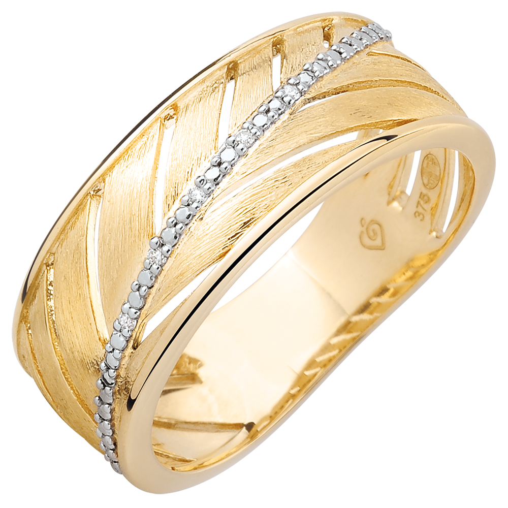 Une bague large en or jaune brossé toute en légèreté inspirée de la feuille de palme. Sa tige principale est ornée d'une rivière de diamants. Une bague à porter tous les jours ou pour les grandes occasions. 5 diamants : 0.02 carat - Or jaune (9 carats = 375/1000): 2.9 g.Plus dimensions