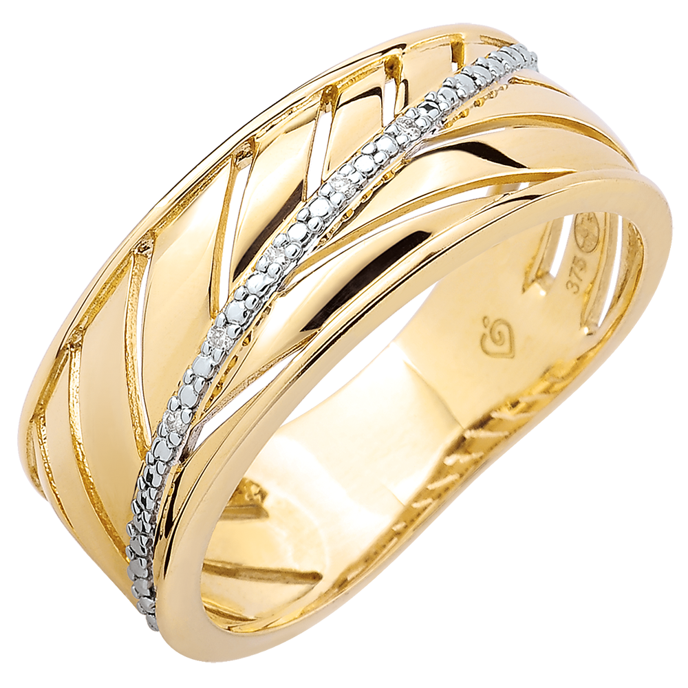 Une bague large en or jaune toute en légèreté inspirée de la feuille de palme. Sa tige principale est ornée d'une rivière de diamants. Une bague à porter tous les jours ou pour les grandes occasions. 5 diamants : 0.02 carat - Or jaune (9 carats = 375/1000): 3.3 g.Plus dimensions