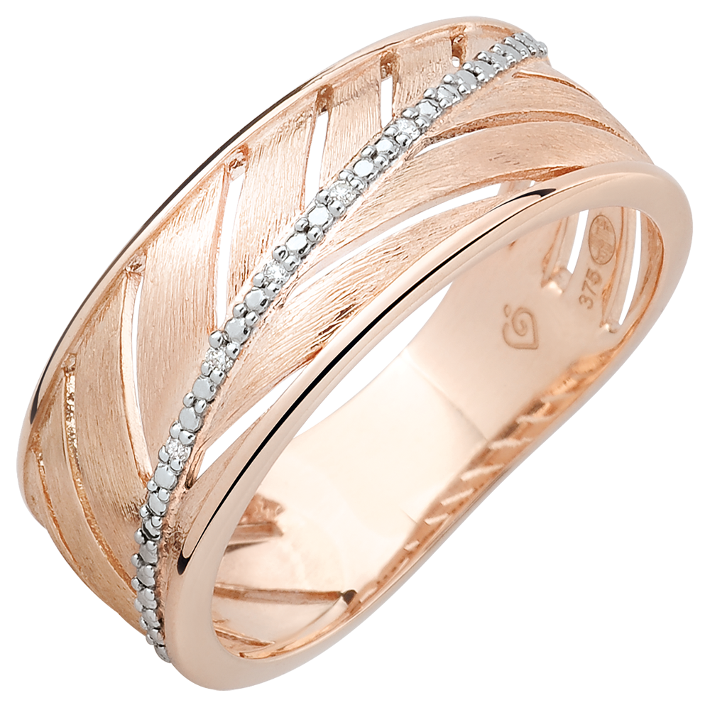 Une bague large en or rose brossé toute en légèreté inspirée de la feuille de palme. Sa tige principale est ornée d'une rivière de diamants. Une bague à porter tous les jours ou pour les grandes occasions. 5 diamants : 0.02 carat - Or rose (18 carats = 750/-): 4.4 g.Plus dimensions