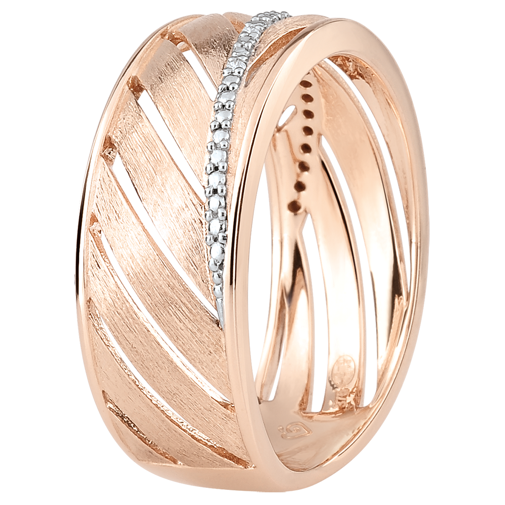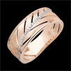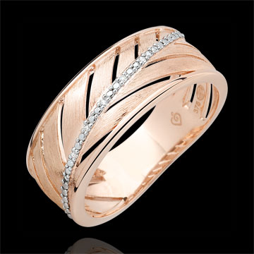 Une bague large en or rose brossé toute en légèreté inspirée de la feuille de palme. Sa tige principale est ornée d'une rivière de diamants. Une bague à porter tous les jours ou pour les grandes occasions. 5 diamants : 0.02 carat - Or rose (9 carats = 375/1000): 3.3 g.Plus dimensions
