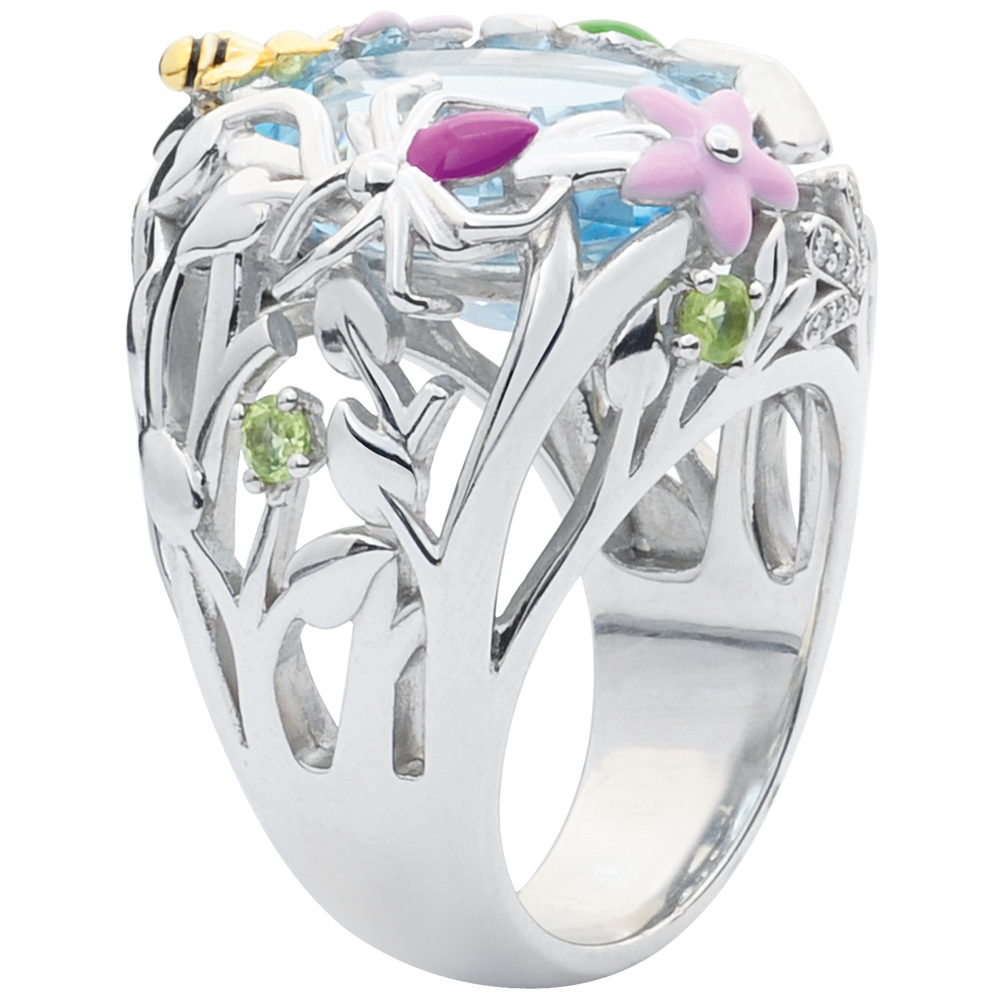 « Bague très originale avec ses incrustations de fleurs et d'insectes, entourés de pierres fines. Compte tenu de son volume, amoureuse de la discrétion s'abstenir .... »