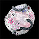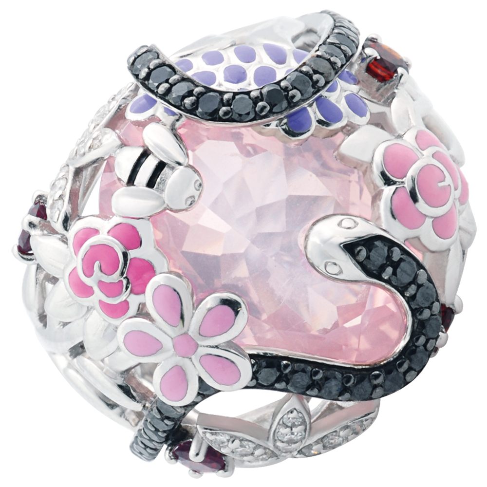 Un jardin rose fleuri est traversé par un serpent de diamants noirs qui se love autour d'un quartz rose. Pierres fines, diamants et laque. 18 diamants : 0.59 carat - Argent massif 925/-: 14.1 g. Quartz rose : 1 - Grenat : 4 - Diamant : 18 - Diamant noir : 45 - Total: 8.94 carat Plus dimensions