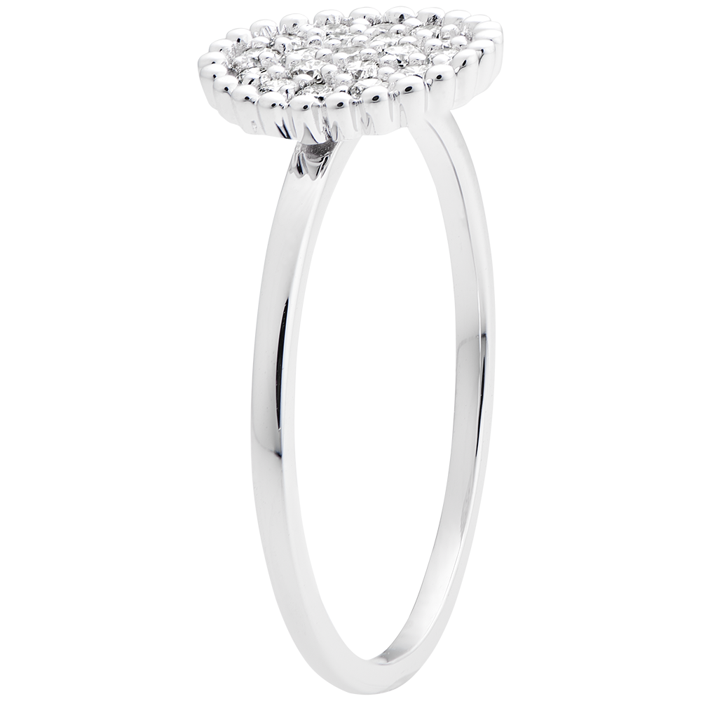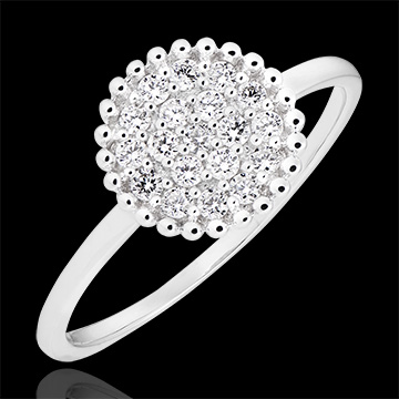 Une bague fine et éclatante grâce à son pavage concentrique de diamants. 19 diamants : 0.21 carat - Or blanc (9 carats = 375/1000): 1.5 g. Cluster de diamants naturels : 19 - Plus dimensions