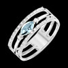 Telles deux paupières précieuses, les lignes d'or et diamants protègent la précieuse pupille symbolisée par une navette de topaze bleue. Une bague sophistiquée à porter tous les jours ou en bague d'exception. Dimensions pierre centrale : longueur: 6mm - largeur: 3mm. 32 diamants : 0.14 carat - Or blanc (9 carats = 375/1000): 2.3 g. Topaze bleue : 1 - Diamant : 32 - Total: 0.27 carat Plus dimensions