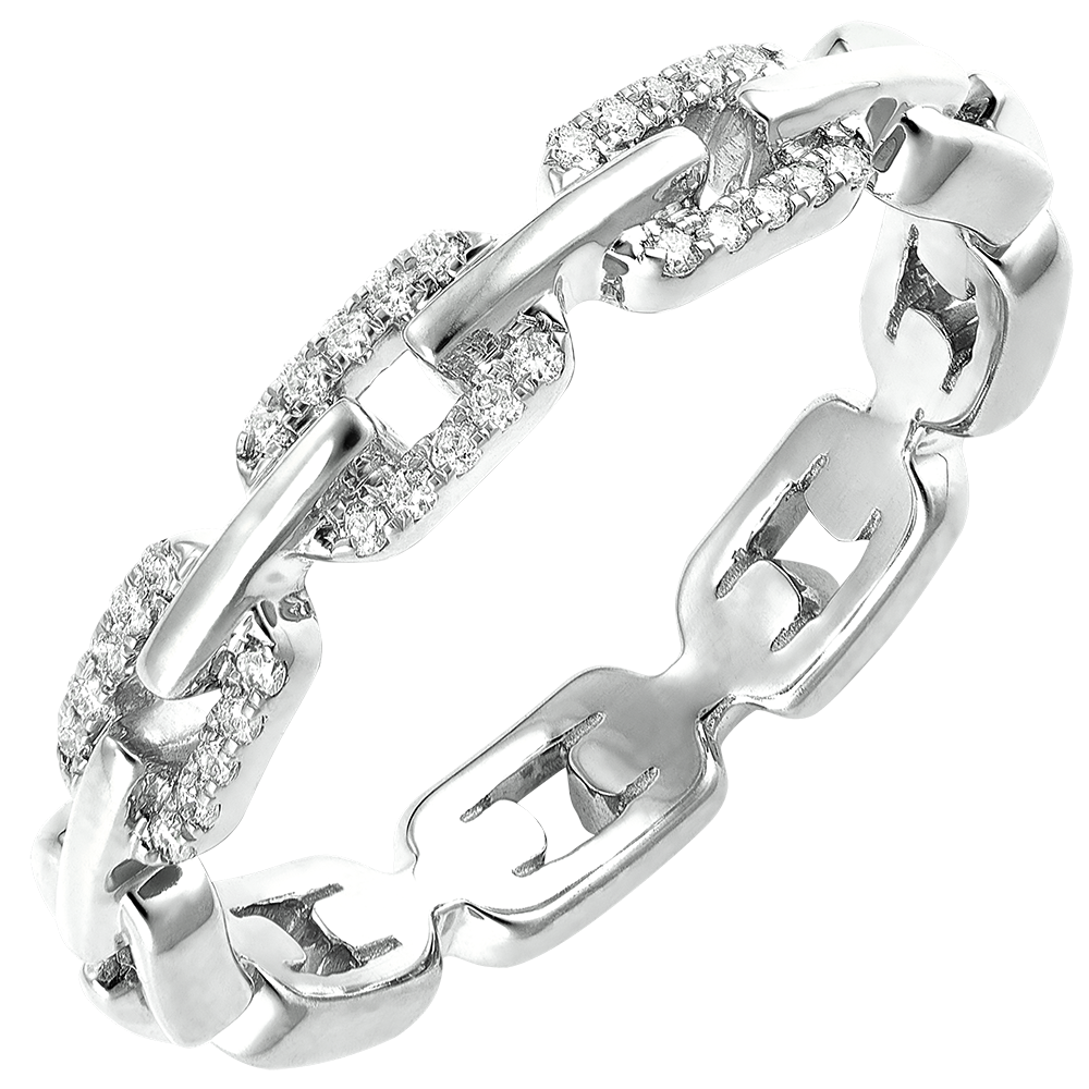 De généreux maillons cubains sertis de diamants illuminent cette bague or blanc pour un classique revisité.