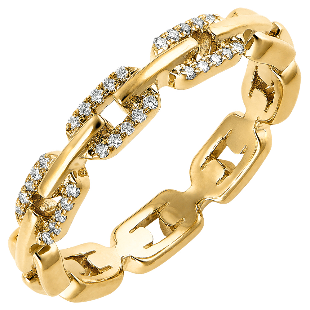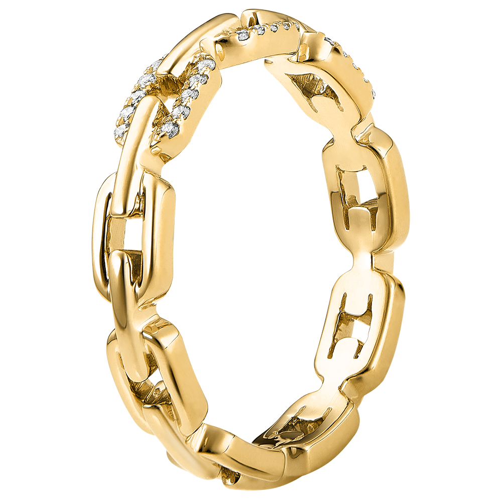 De généreux maillons cubains sertis de diamants illuminent cette bague or jaune pour un classique revisité.
