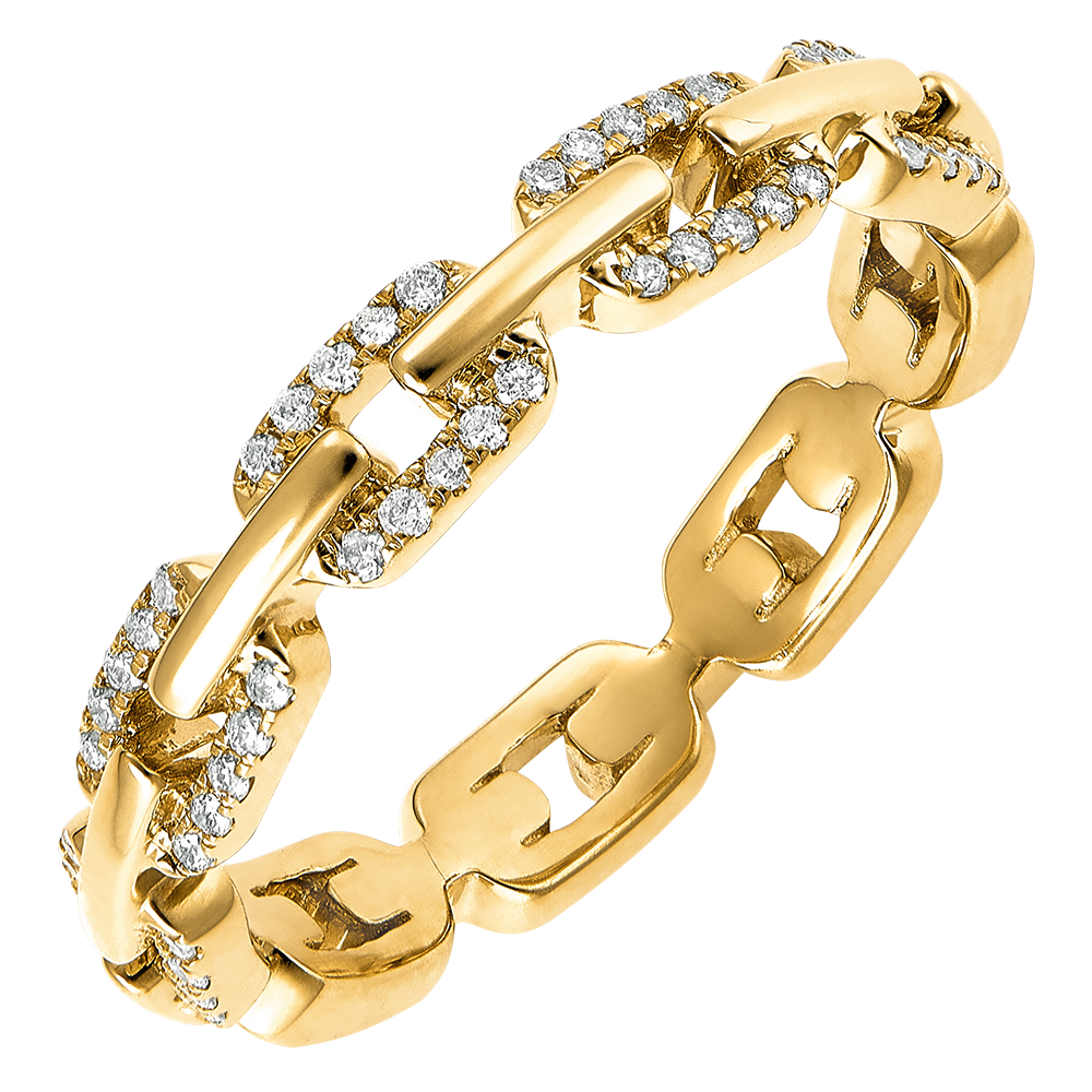 De généreux maillons cubains sertis de diamants illuminent cette bague or jaune pour un classique revisité.