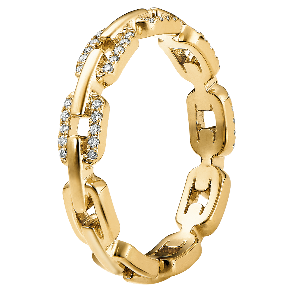 De généreux maillons cubains sertis de diamants illuminent cette bague or jaune pour un classique revisité.