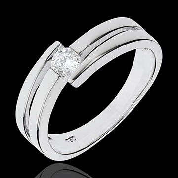 les anneaux d'or blanc se jouent de leur forme pour encadrer en symétrie un diamant solitaire