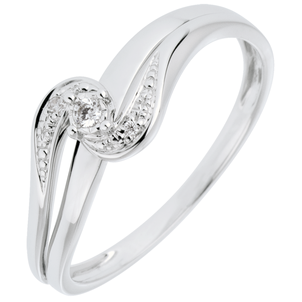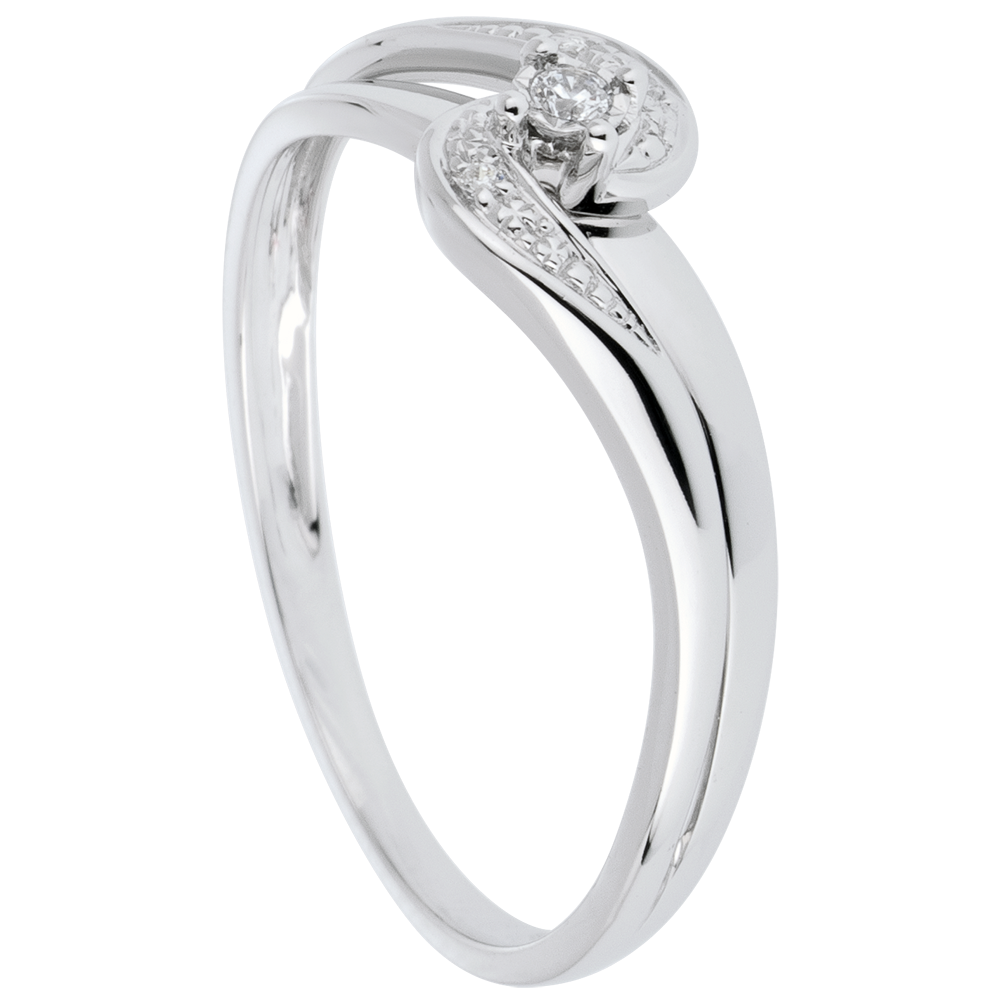 Un diamant solitaire posé sur un mouvement d'or blanc lisse est embrassé et maintenu passionnément par une double courbe d'or travaillée façon diamant. Diamant central: 0.013 carat