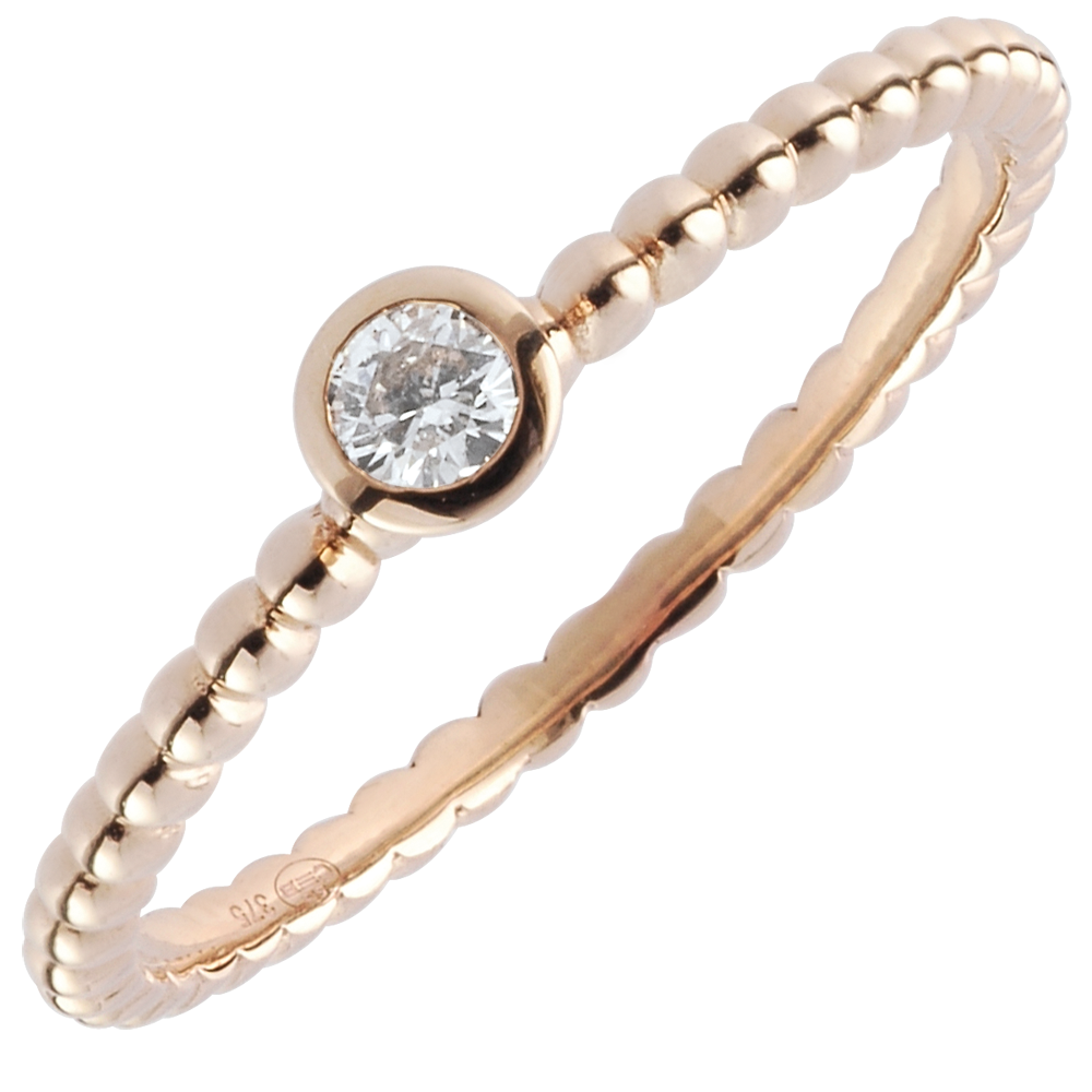 Une myriade de perles d'or se succèdent pour accompagner un diamant solitaire serti clos. Une bague de fiançailles moderne et féminine. 1 diamant : 0.08 carat - Or rose (18 carats = 750/-): 1.3 g. Plus dimensions