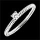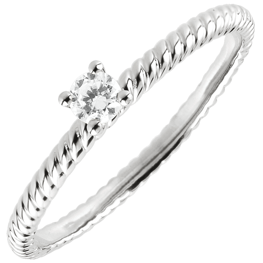 Un diamant solitaire maintenu par 4 griffes et posé sur un précieux cordage d'or. Une bague de fiançailles originale et intemporelle. 1 diamant : 0.1 carat - Or blanc (9 carats = 375/1000): 1.1 g. Plus dimensions