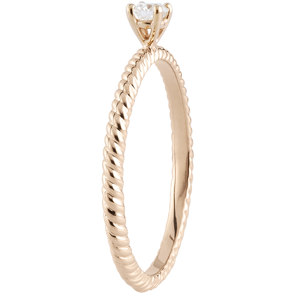 Un diamant solitaire maintenu par 4 griffes et posé sur un précieux cordage d'or. Une bague de fiançailles originale et intemporelle. 1 diamant : 0.1 carat - Or rose (18 carats = 750/-): 1.5 g. Plus dimensions